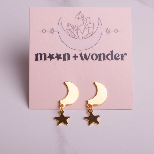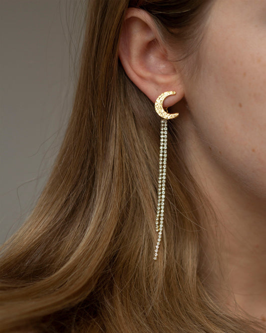 Esti Gold Crescent Moon Stud Earrings With CZ Tassle